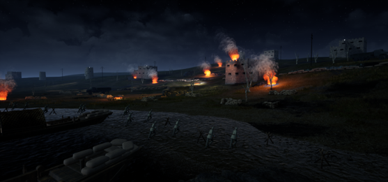 山顶歼敌:体验者卧地射击(蹲在石头后面),在子弹耗尽之后,队长下达命令,捡起地上的石块向敌人投掷,石块投掷结束,接着面板提示,观看队长把从敌人手中缴获的枪支砸碎。接着队长语音“同志们,我们的任务胜利完成了”。
